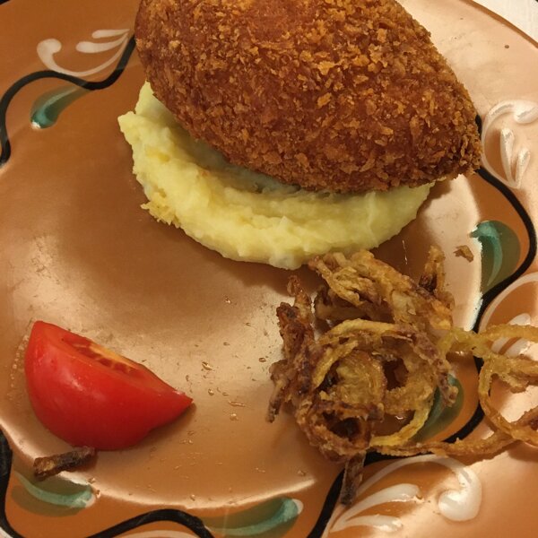 Огромная котлета по киевски. Интересная свинина с грибами под сырной шапкой.